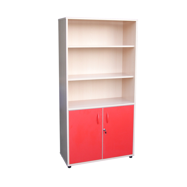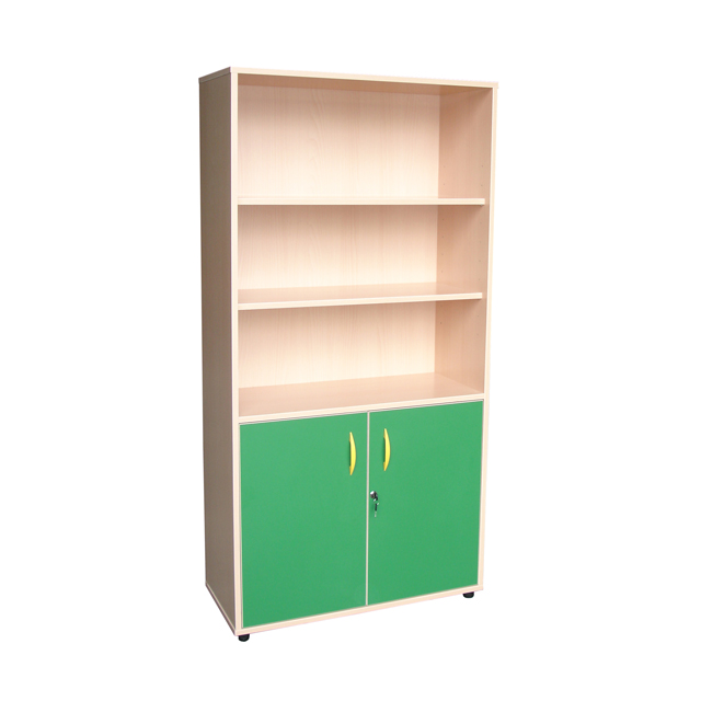 Armario de puertas bajas con cerradura fabricado en tablero bilaminado de 19mm con cuatro estantes regulables (uno fijo). Patas soporte de plástico con nivelación de 50mm. Tirador de color. Incluye cerradura con dos llaves.