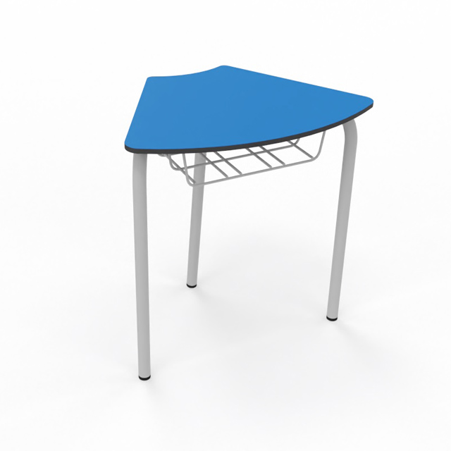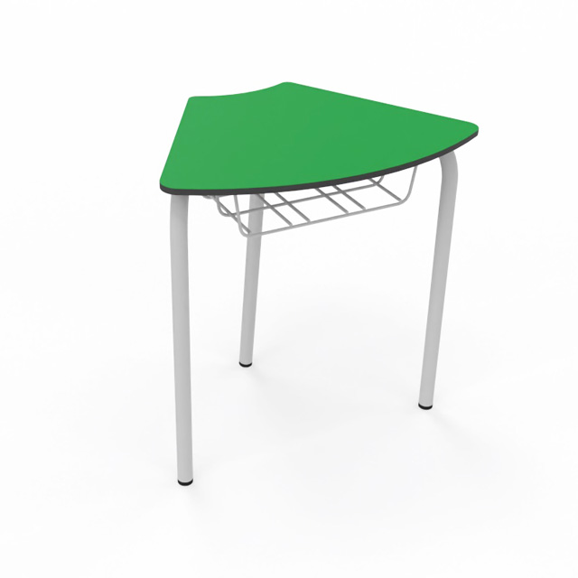 Mesa modular abatible con bandeja de colectividad para aulas de aprendizaje cooperativo. Su diseño permite distintas combinaciones para trabajar en grupo o individualmente. Se pueden formar círculos de 150cm de diámetro con 6 mesas, además de muchos otros diseños. La tapa de 72x53cm es abatible, por lo que permite plegarlas en muy poco espacio. Estructura metálica Ø35mm soldada pintada en epoxy. Tapa fabricada en Compac Plus HPL® de 14mm con cantos mecanizados en redondo. Bandeja portalibros de parrilla metálica.