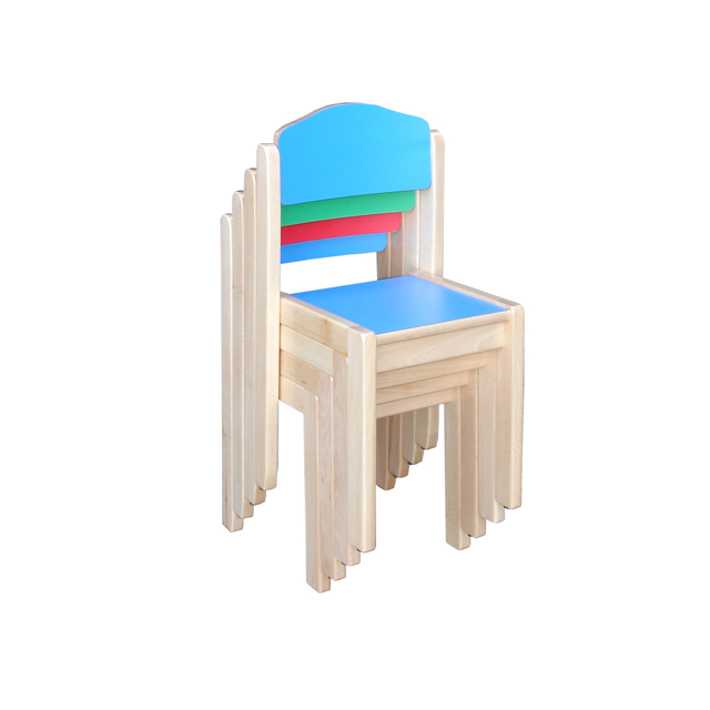 Silla de preescolar fabricada en madera de haya barnizada. Asiento y respaldo de madera contrachapada con lamidado estratificado HPL de colores rojo, verde, amarillo o azul. Apilable. Disponible en altura 26cm (talla 1), 30cm (talla 2) y 34cm (talla 3) y bajo pedido en 20cm (talla 0).