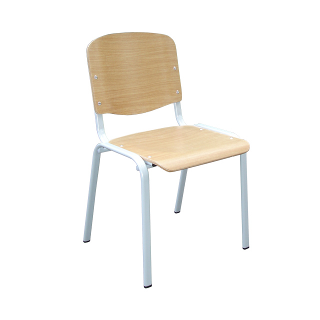 Silla escolar con estructura metálica soldada de tubo oval pintada en epoxy. Asiento y respaldo laminados estratificados HPL sobre base contrachapada de 10mm. Patas con conteras antisonoras. Apilable.